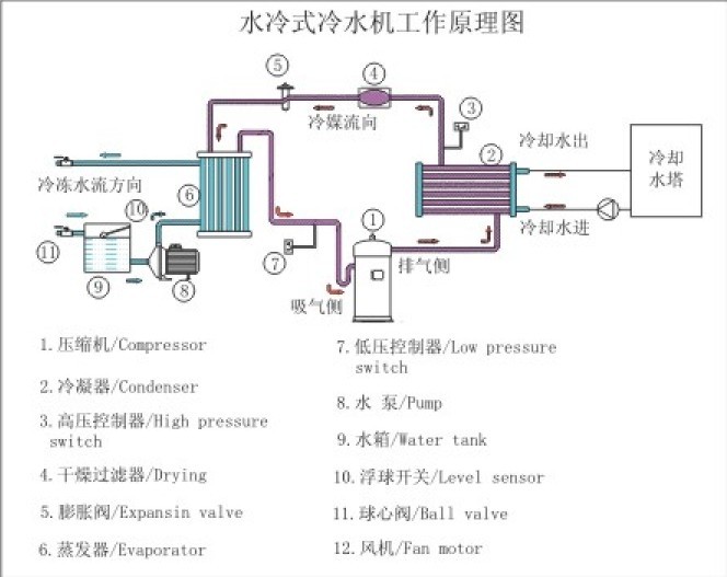 水冷式冷水機(jī),運(yùn)行更為平穩(wěn),冷量損失少,易回油,傳熱管不易發(fā)生凍裂,比風(fēng)冷機(jī)能效高。但水冷機(jī)占地廣,且在價(jià)格上要比風(fēng)冷高一些。在選擇冷水機(jī)時(shí)一定考慮客觀環(huán)境因素,選擇合適的類(lèi)型。